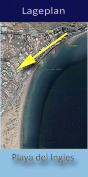 Das Apartment-Haus Strelizias liegt im touristischen Zentrum von Playa del Ingles, nur etwa 500 Meter zum Hauptstrand.