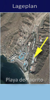 Das Apartments HV Vista Taurito liegt erhöht auf dem Osthang in der Bucht von Taurito (Nachmittags-Sonne).